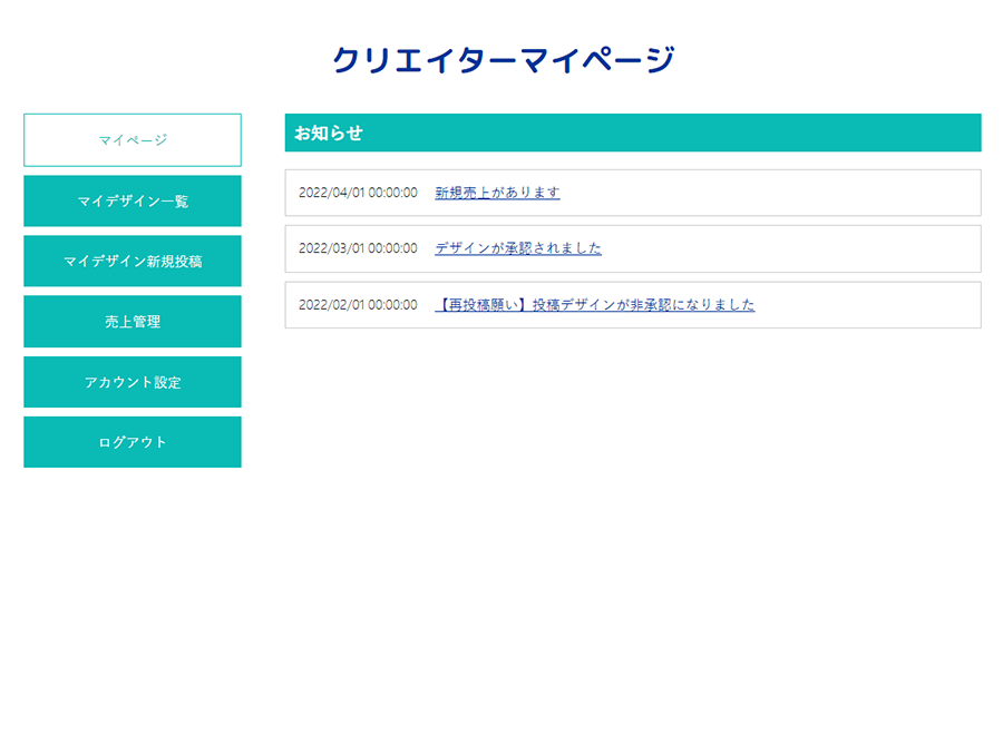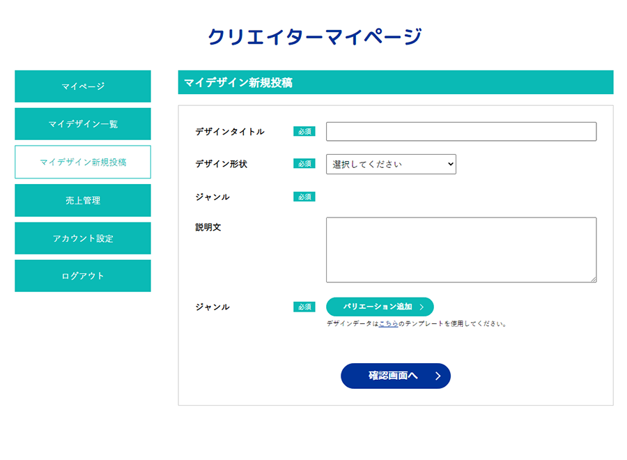 クリエイターユーザーでログインした後、マイページから「マイデザイン新規投稿」ページへ移動します。